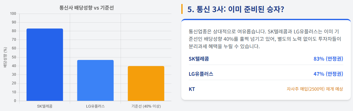 전통적인 고배당주인 통신사들도 주목해야 합니다. 안정적인 현금 흐름을 바탕으로 배당금을 꾸준히 늘리고 있어 '배당 성장' 요건을 충족하기 유리합니다. 불확실한 장세에서 방어주 역할도 톡톡히 할 것입니다.