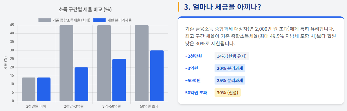 | 2,000만 원 초과 ~ 3억 원 이하 | 20% | ★ 핵심 수혜 구간! (종합과세 회피 가능) |
