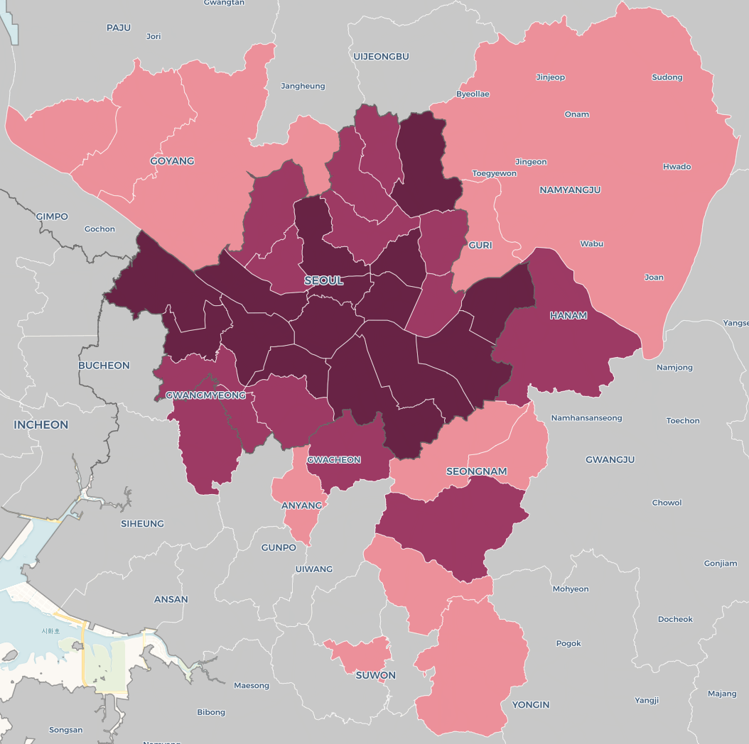 - 서울 (총 25개 자치구): 강남, 서초, 송파, 용산을 포함한 서울 전 지역