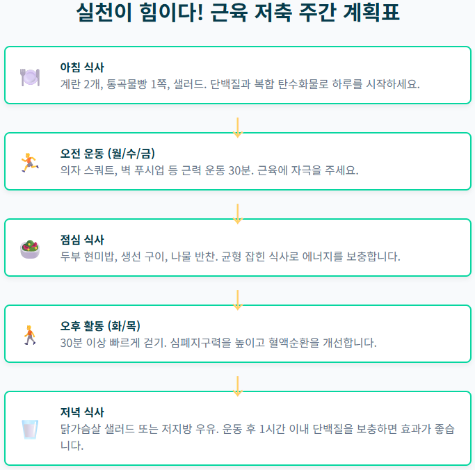 운동이 근육을 만드는 '신호'라면, 영양은 '재료'입니다. 특히 60대 이후에는 단백질 흡수 효율이 떨어지므로, 더 의식적으로 잘 챙겨 먹는 것이 중요합니다.