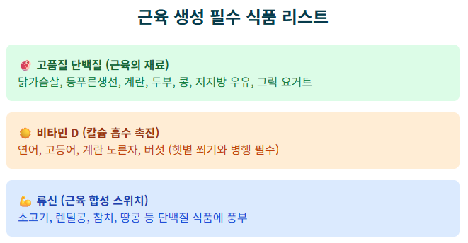 운동이 근육을 만드는 '신호'라면, 영양은 '재료'입니다. 특히 60대 이후에는 단백질 흡수 효율이 떨어지므로, 더 의식적으로 잘 챙겨 먹는 것이 중요합니다.