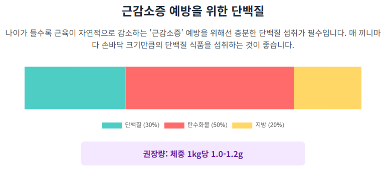- 필요성: 나이가 들수록 근육 합성 능력은 떨어지고 분해 속도는 빨라져 젊을 때보다 더 많은 단백질이 필요합니다.