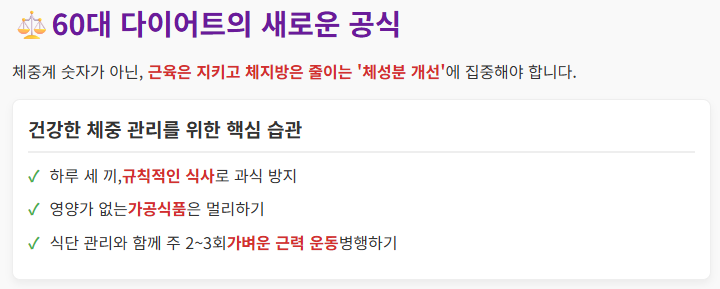 60대의 다이어트는 체중계 숫자가 아닌, **근육은 지키고 체지방은 줄이는 '체성분 개선'**에 목표를 두어야 합니다.