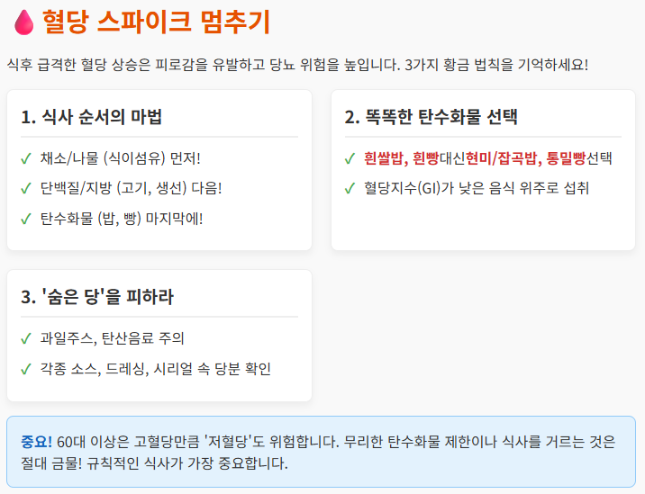 60대 건강 관리의 핵심은 **'혈당 안정화'**입니다. 식사 후 혈당이 급격히 오르내리는 '혈당 스파이크'는 당뇨, 심혈관 질환, 비만의 주범입니다.